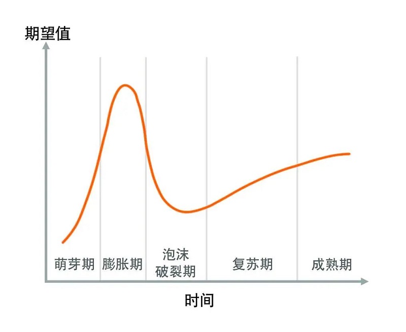 總結(jié)來說,一項(xiàng)新技術(shù)誕生時(shí),會(huì)以最瘋狂的速度攀升至頂端,然后迅速下滑墜至谷底,之后再緩慢平穩(wěn)地上升。