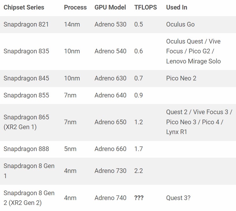 高通芯片組中使用的GPU系列品牌為Adreno,初代Quest采用Adreno 540、具有0.6萬億次浮點運算性能,而Quest 2配備了采用Adreno 650的三代更新芯片組,以1.2萬億次浮點運算的速度提供兩倍的性能。