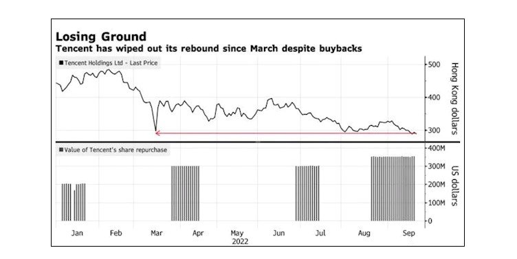 同時(shí),騰訊不光在投資領(lǐng)域收縮陣線,其自身股價(jià)的一路下滑也讓眾人倍感壓力。數(shù)據(jù)顯示,騰訊在近1年半的時(shí)間里,股價(jià)跌幅近60%,市值蒸發(fā)4.4萬億元。為了穩(wěn)定股票價(jià)格,增強(qiáng)投資者信心,近期騰訊也在開展大規(guī)模的回購,或許給公司的流動資金帶來壓力,從而影響到對外的投資和收購。