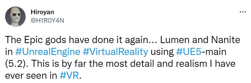雖然在全面優(yōu)化VR頭顯所需的性能水平方面仍有可能取得進展,但開發(fā)者已開始在VR模式下嘗試Lumen和Nanite,并取得了驚人的結(jié)果。