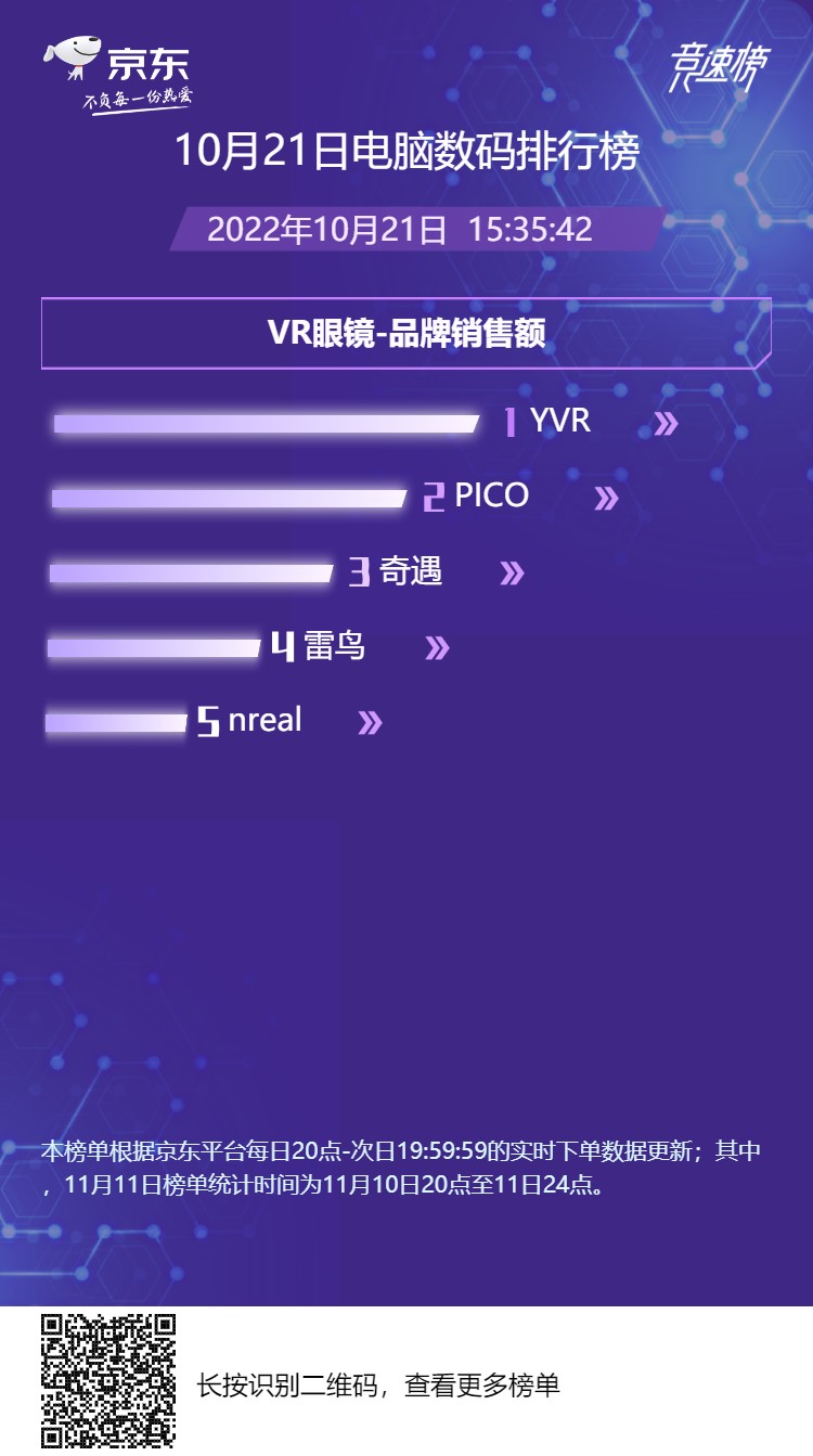 YVR京東預(yù)售上線后,銷量節(jié)節(jié)攀升,僅60分鐘瘋狂預(yù)售突破1500臺(tái),平均每分鐘預(yù)售25臺(tái)。YVR徹底點(diǎn)燃用戶熱情,引領(lǐng)京東雙11元宇宙賽道,一舉斬獲京東預(yù)售“VR眼鏡品牌銷售額”榜首(數(shù)據(jù)截止完稿時(shí)間)。