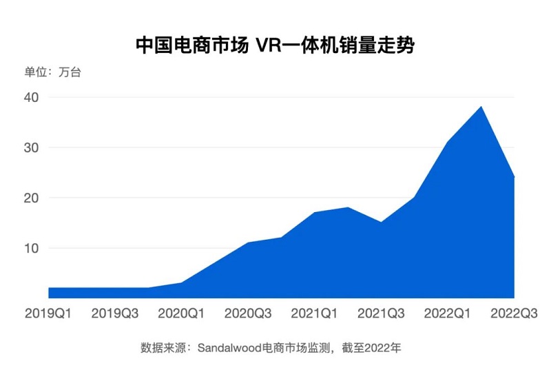 VR終端的發(fā)展理論上將現(xiàn)有終端互聯(lián)網(wǎng)體驗從二維擴(kuò)展到三維空間,讓消費(fèi)者的信息獲取、娛樂、生活等擁有身臨其境的存在式體驗與效率提升,是對用戶體驗的一次突破性升維。根據(jù)Sandalwood中國電商市場監(jiān)測數(shù)據(jù),2022年前三季度,中國電商市場VR一體機(jī)銷量已達(dá)93萬臺,2021年同期銷量為50萬臺,同比增長86%。