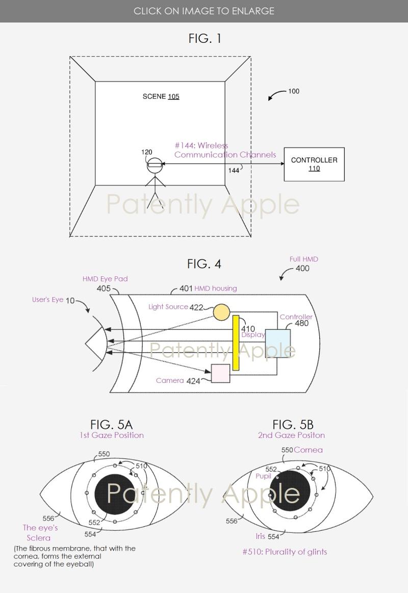蘋(píng)果專(zhuān)利圖4顯示了頭戴式設(shè)備(#400)的框圖,外殼(#401)還包括了一個(gè)或多個(gè)光源#422、相機(jī)424和控制器480的眼動(dòng)追蹤系統(tǒng);該工作原理為,一個(gè)或多個(gè)光源422將光發(fā)射到“用戶(hù)10”眼睛,該光反射為可由相機(jī)424檢測(cè)到的光模式(例如,一圈閃光);基于光線(xiàn)模式,控制器480可以確定用戶(hù)的眼睛追蹤特性:例如,控制器480確定用戶(hù)注視方向和/或用戶(hù)眨眼狀態(tài)(睜眼或閉眼);作為另一示例,控制器480可確定用戶(hù)瞳孔中心、瞳孔大小或關(guān)注點(diǎn)。
