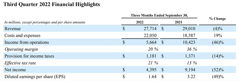 2022年Q3,Meta的主營(yíng)業(yè)務(wù)收入為277.14億美元,同比下降4%;主營(yíng)業(yè)務(wù)支出達(dá)到220.5億美元,同比上漲19%;經(jīng)營(yíng)利潤(rùn)56.65億美元,同比大幅下降46%,利潤(rùn)率同比由36%降至20%;凈收入43.95億美元,同比大幅下跌52%;攤薄每股收益為1.64美元,跌幅達(dá)到49%。