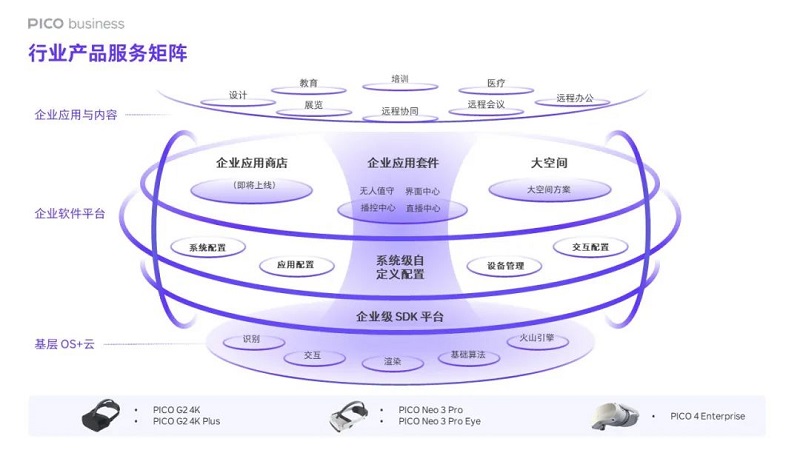 目前PICO的企業(yè)級(jí)硬件產(chǎn)品包括6 DoF VR一體機(jī)“PICO Neo3 Pro/Pro Eye”和3DoF VR一體機(jī)“PICO G2 4K”,還有即將上市的PICO 4 Enterprise。除了專門為企業(yè)用戶打造的一流硬件之外,PICO還為企業(yè)用戶提供基層OS+云層、行業(yè)軟件平臺(tái)、以及行業(yè)應(yīng)用與內(nèi)容層,幫助企業(yè)更好地管理和部署設(shè)備,保證硬件性能得到最大發(fā)揮。