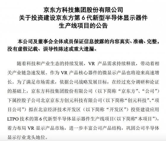 京東方A發(fā)布公告稱,公司下屬控股子公司北京京東方創(chuàng)元科技有限公司擬在北京經(jīng)濟(jì)技術(shù)開發(fā)區(qū)投資建設(shè)應(yīng)用LTPO技術(shù)的第6代新型半導(dǎo)體顯示器件生產(chǎn)線項(xiàng)目, 著力布局VR顯示產(chǎn)品市場,進(jìn)一步豐富公司產(chǎn)品結(jié)構(gòu),鞏固公司半導(dǎo)體顯示行業(yè)龍頭地位。