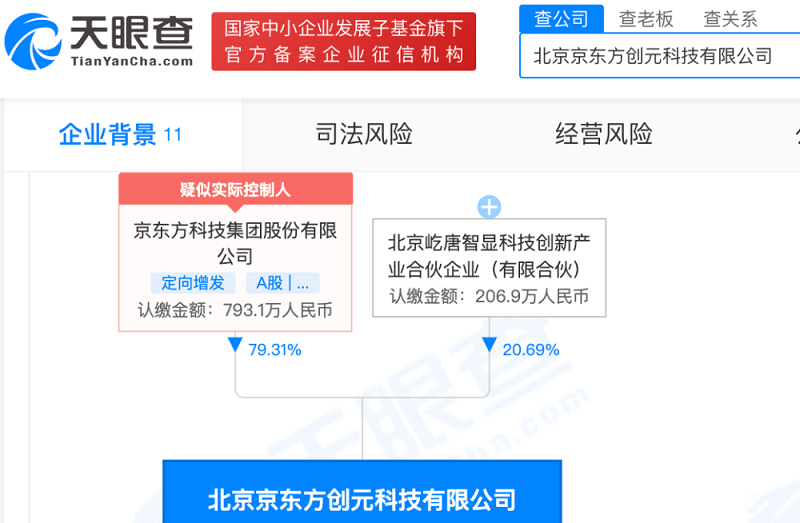 北京京東方創(chuàng)元科技有限公司日前成立,京東方科技集團(tuán)股份有限公司持股79.31%,天眼查App顯示,該公司經(jīng)營范圍含顯示器件制造;顯示器件銷售;電子元器件制造、批發(fā)、零售等。