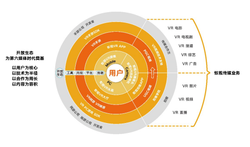 從這張VR生態(tài)示意圖上可以看到,位于中心位置的是用戶,這也是蟻視“以用戶為中心”理念的體現(xiàn)。圍繞用戶的是蟻視的VR設(shè)備,包括PC端的蟻視VR頭盔、移動端的蟻視VR眼鏡和蟻視VR運(yùn)動相機(jī),這些設(shè)備均為蟻視自主研發(fā),在全球VR領(lǐng)域?qū)儆陧敿壟渲茫軌騽?chuàng)造完美的VR應(yīng)用體驗(yàn),為用戶進(jìn)入VR世界提供了硬件支持。