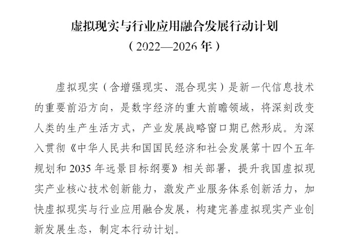 11月1日,工業(yè)和信息化部、教育部、文化和旅游部、國家廣播電視總局、國家體育總局印發(fā)《虛擬現(xiàn)實(shí)與行業(yè)應(yīng)用融合發(fā)展行動計(jì)劃(2022—2026年)》(以下簡稱《行動計(jì)劃》)。