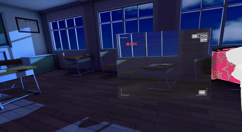 值得一提的是,VR互動(dòng)漫《探靈VLOG》巧妙地利用了DV機(jī)這一特殊媒介,用戶可以化身攝影師,通過(guò)操作手中的DV機(jī)移動(dòng)取景框看常人肉眼看不到的靈異世界。例如消失的出口、突顯的血腳印、變成鬼的鋼琴老師等等。這極大的將漫畫(huà)中的虛擬與現(xiàn)實(shí)相連,增強(qiáng)了用戶自身的代入感。