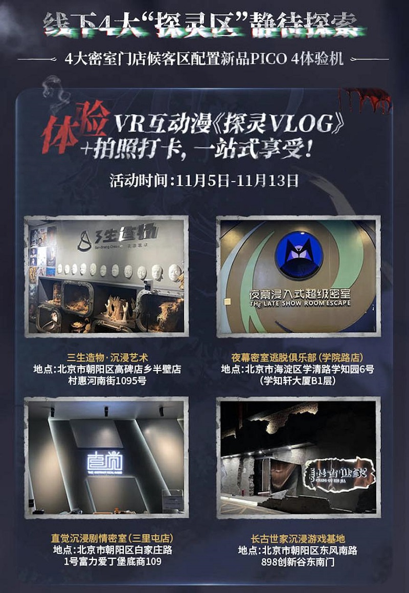 為了讓更多人能夠切身體驗(yàn)這一獨(dú)特的觀漫新形式,11月5日-11月13日,PICO將與三生造物·沉浸藝術(shù)、夜幕密室逃脫俱樂(lè)部、直覺(jué)沉浸劇情密室、長(zhǎng)古世家沉浸游戲基地同步在線下舉辦體驗(yàn)周活動(dòng),到店可參與VR互動(dòng)漫《探靈VLOG》體驗(yàn),開(kāi)啟觀漫新姿勢(shì),在拍照區(qū)打卡分享,還有機(jī)會(huì)獲得精美禮品!