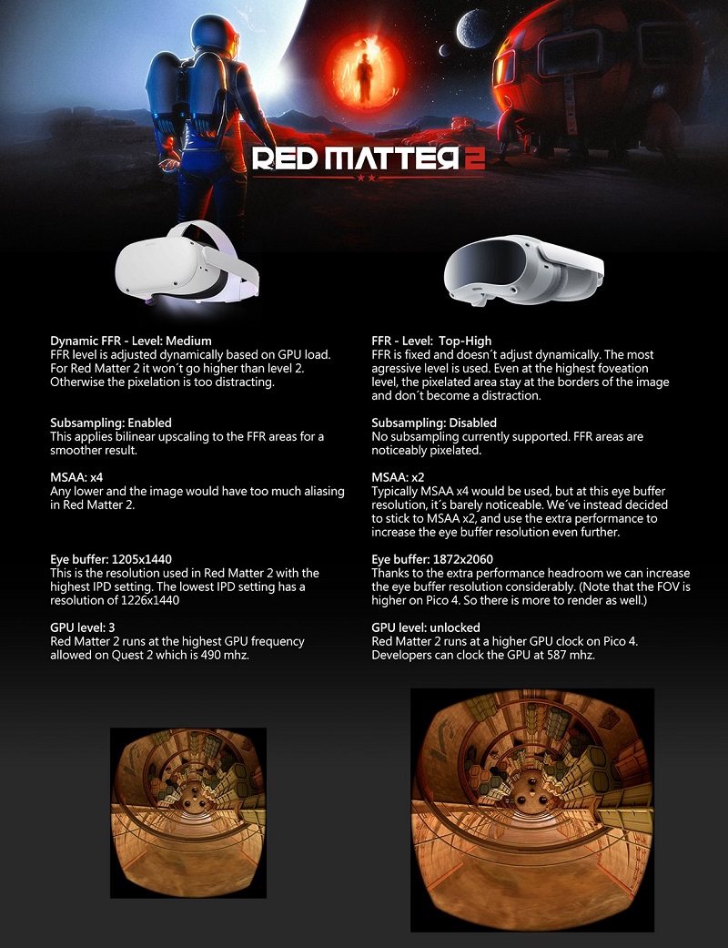 隨著VR科幻冒險游戲「Red Matter 2」即將登陸PICO 4平臺,游戲開發(fā)商西班牙游戲工作室Vertical Robot透露了「Red Matter 2」Meta Quest 2版與PICO 4版本之間的參數(shù)差異,并對PICO 4版硬件性能印象深刻。