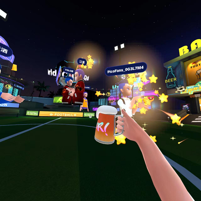 《世界杯狂歡夜》360°實(shí)景高度還原了真人派對(duì)的氛圍,在家?guī)螾ICO VR一體機(jī)即可擁有線(xiàn)下看球的沉浸式體驗(yàn)。同時(shí),虛擬巨幕打造了沉浸式看球場(chǎng)景,在這里用戶(hù)可選擇多區(qū)域、不同視角來(lái)觀(guān)看世界杯比賽,如主場(chǎng)球迷、客場(chǎng)球迷、VIP區(qū)域等等,為支持的球隊(duì)吶喊助威,跟著足球?qū)氊悺J嗨翻全場(chǎng)。