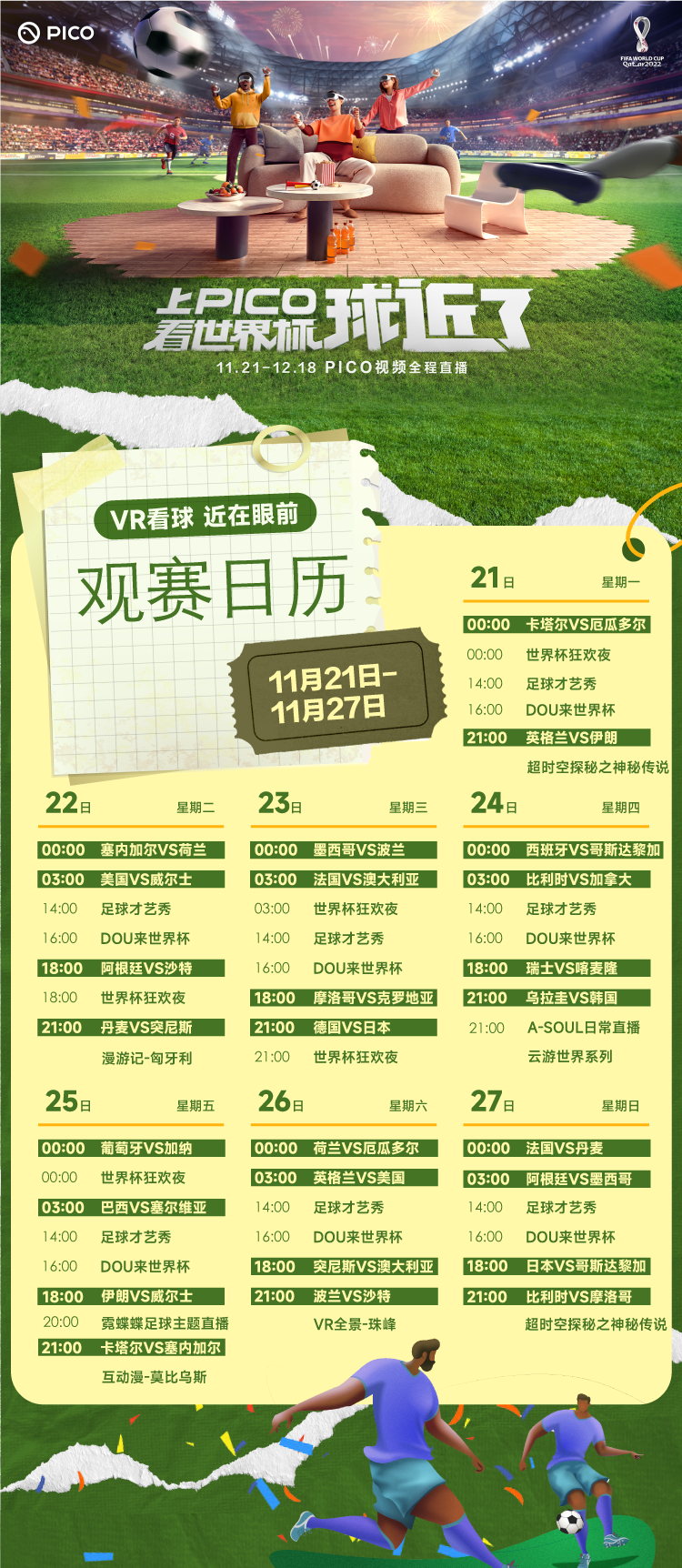 為了今年的世界杯,卡塔爾在沙漠中建造了一座城,而PICO為了讓無(wú)法去現(xiàn)場(chǎng)看球的球迷更沉浸地觀(guān)看世界杯,專(zhuān)門(mén)打造了PICO世界杯會(huì)場(chǎng)。比賽正式開(kāi)啟前,球迷就可以通過(guò)PICO VR一體機(jī)觀(guān)看《DOU來(lái)世界杯》欄目,知名足球解說(shuō)段暄同老搭檔張路為球迷分享足球知識(shí)、趣味預(yù)測(cè)賽事、回顧歷屆世界杯故事和高光時(shí)刻。節(jié)目現(xiàn)場(chǎng)與劉畊宏連線(xiàn)跳起了開(kāi)場(chǎng)舞,同時(shí)在節(jié)目中還與荷蘭足球運(yùn)動(dòng)員范佩西視頻連線(xiàn),為球迷帶來(lái)更專(zhuān)業(yè)有趣的內(nèi)容。21日晚間的比賽,驚喜嘉賓鹿晗也加盟解說(shuō)團(tuán),與球迷一起看球、聊天。