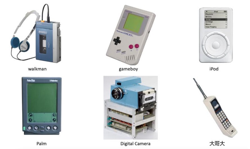 我們先從這幅圖開始講,這幅圖講的是過去50年消費(fèi)電子硬件的進(jìn)展。我們現(xiàn)在如果回到20世紀(jì)70年代左右,我們會發(fā)現(xiàn),1970年到2000年出現(xiàn)了各種消費(fèi)電子產(chǎn)品,比如說索尼的成名之作Walkman,又比如1989年任天堂推出的Game Boy,2000年以后出的iPod ,然后是Palm和數(shù)碼相機(jī),還有1973年就出現(xiàn)的大哥大。