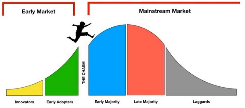 在跨越鴻溝理論中,提到了兩個鴻溝,一個是早期市場的鴻溝,一個是主流市場的鴻溝。