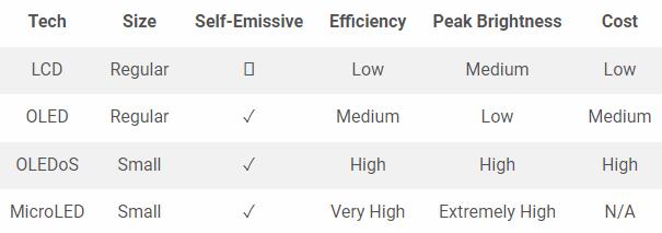 MicroLED是一種全新的顯示技術(shù),而不是“Mini LED”或“QLED”等LCD的變體,MicroLED 與OLED一樣是自發(fā)光的,這意味著像素輸出光和顏色不使用背光,但更節(jié)能且可以達(dá)到更高的亮度,這使得MicroLED非常適合消費(fèi)類(lèi)AR眼鏡。