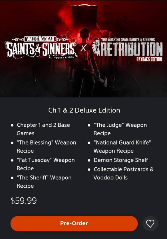 「行尸走肉:圣徒與罪人」第二章:“Retribution”在PlayStation Store的售價(jià)為39.99美元。「行尸走肉:圣徒與罪人」第一章Tourist Edition版本和「行尸走肉:圣徒與罪人」第二章:“Retribution”豪華捆綁包僅售價(jià)59.99美元。
