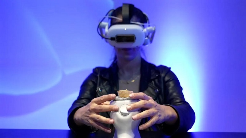 Casalegno還為這一裝置開發(fā)了一種定制配件,可將Meta Quest 2 VR的手部控制器在頭顯中的顯示方式變成帶有未來感的餐具,以便于客戶能夠更加輕松地定位他們在VR用餐體驗中餐品的位置。