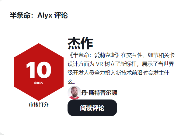 毫無意外,《愛莉克斯》當(dāng)年一舉斬獲“2020年最佳VR游戲”獎(jiǎng)項(xiàng),IGN也拿下了10分滿分成績,與《戰(zhàn)神》、《最后生還者》等響當(dāng)當(dāng)?shù)挠螒虼笞鞴蔡幰皇遥f是光耀VR游戲門楣也不為過。而且時(shí)至今日,《愛莉克斯》仍保持著98% 超高好評(píng)率!