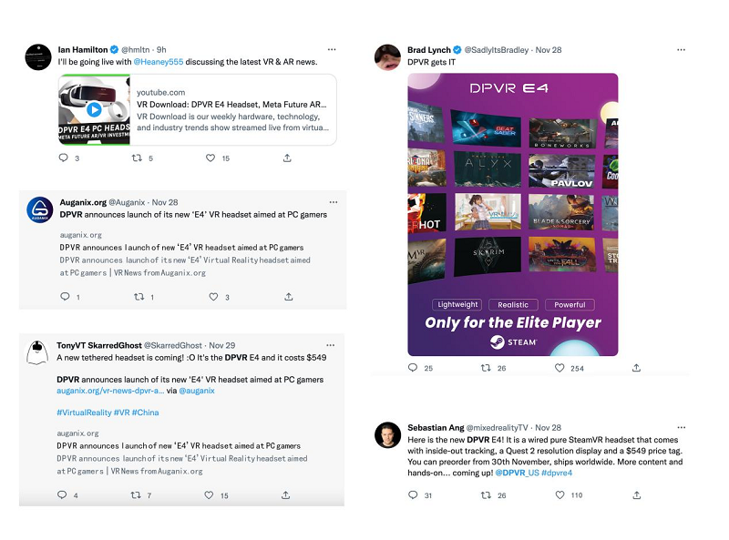 看著大朋VR E4在性能、功能、服務(wù)等方面做出的諸多革新優(yōu)化,不少海外科技、游戲圈達(dá)人也紛紛在第一時(shí)間轉(zhuǎn)發(fā)關(guān)注,并表示將直播討論E4相關(guān)內(nèi)容,期待之意溢于言表。
