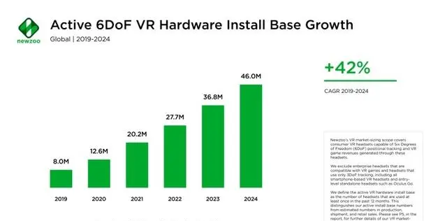 根據(jù)權(quán)威三方機(jī)構(gòu)Newzoo研究顯示,2022年VR游戲規(guī)模將達(dá)到近18億美元,全球活躍VR數(shù)量將達(dá)到2770萬臺(tái),而這兩項(xiàng)數(shù)值或?qū)⒃?024年分別達(dá)到32億美元和4600萬臺(tái)。