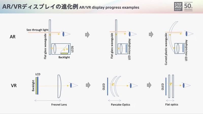Mukawa首先概述了索尼自1996年以來在VR和AR領(lǐng)域開發(fā)的主要產(chǎn)品和原型,然后討論了未來技術(shù),其研究重點(diǎn)為顯示系統(tǒng),Mukawa表示,發(fā)展可能如下: