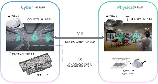 「Cyber-Physical Workplace」將基于BIM數(shù)據(jù)構(gòu)建的VR空間[cyber space]的傳感器信息與使用IoT的真實(shí)空間[physical space]的傳感器信息相結(jié)合,并通過(guò)MR技術(shù)連接不同空間的、以提高生產(chǎn)率的目標(biāo)的MR工作場(chǎng)所。