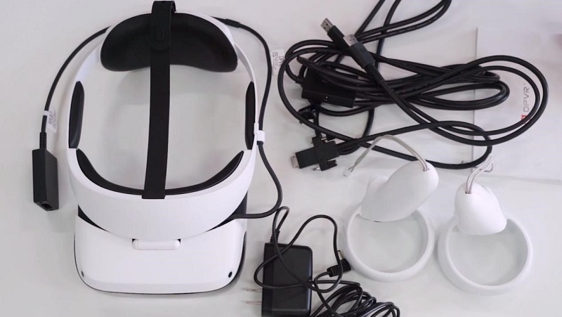 將包裝盒里的全部物品取出,我們可以看到它們包括大朋E4頭顯、兩個手柄、二合一數(shù)據(jù)線、電源適配器和說明書。