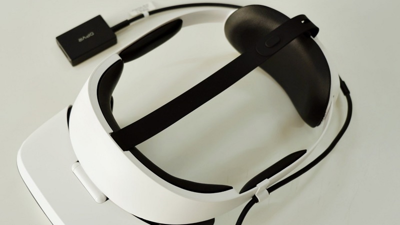 從外觀來看,大朋E4的頭顯部分非常接近PSVR。環(huán)形的頭帶類似一個頭箍,能夠?qū)㈩^顯的重量全部集中在用戶前額和后腦的部位,再加上頭顯主體的配重只有285g(不含頭帶、數(shù)據(jù)線),所以我們在實(shí)際佩戴過程中幾乎沒有感到臉部有任何的壓迫感。