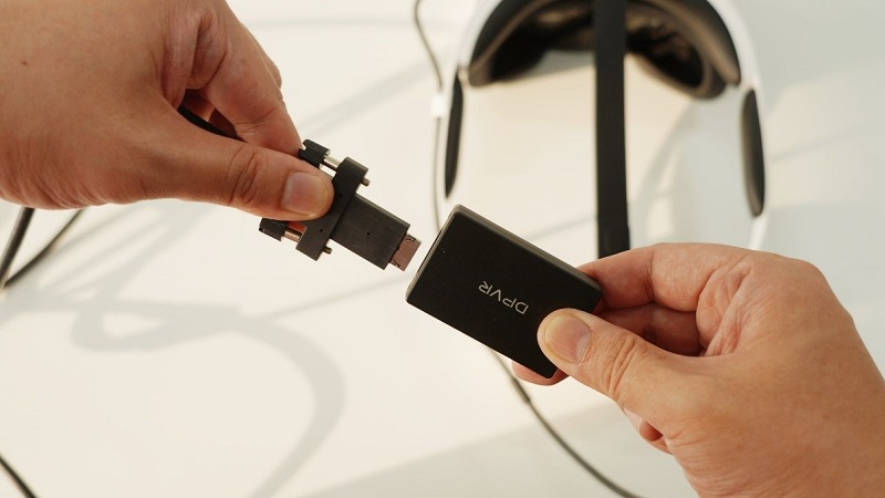 作為一款PCVR頭顯,大朋E4的線纜采用分段式設(shè)計:頭顯部分的線纜很短,其盡頭是一個轉(zhuǎn)換盒子,這個轉(zhuǎn)換盒子再連接一根很長的二合一數(shù)據(jù)線,并通過二合一數(shù)據(jù)線連接PC。這樣的設(shè)計我們認(rèn)為主要是考慮到更多使用場景,線纜的分段式設(shè)計保證了頭顯與PC總體的連接距離可以做到很長,這點(diǎn)對于一些to B場景和某些家里擁有較大空間的用戶非常重要。