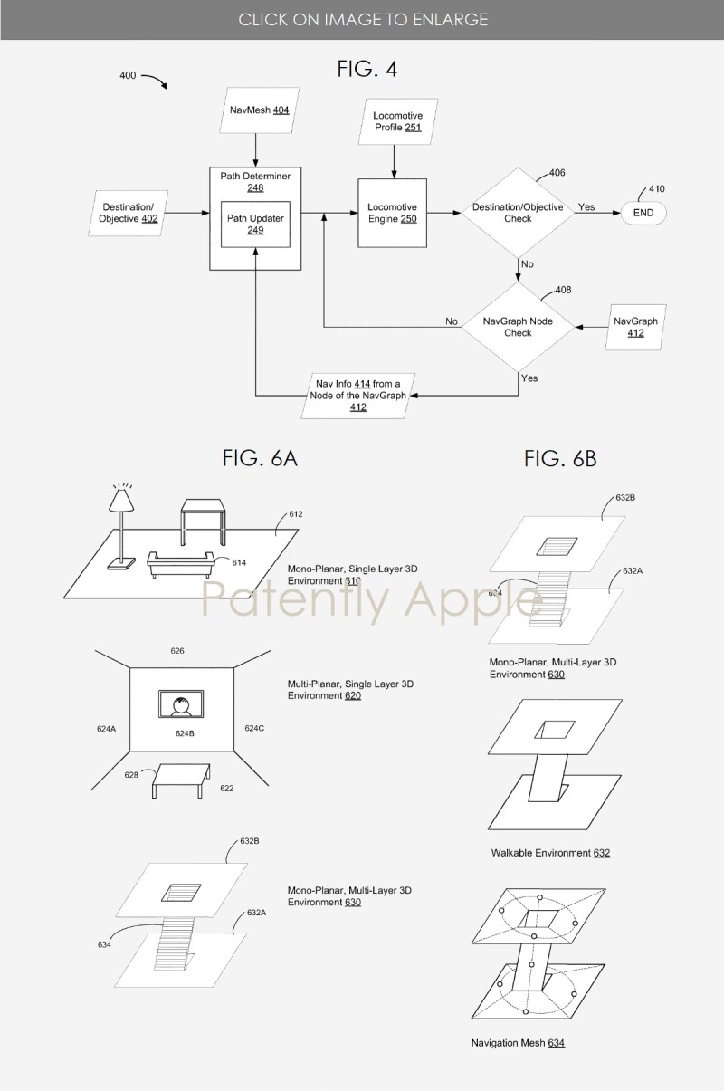 蘋(píng)果專(zhuān)利圖4示例了導(dǎo)航架構(gòu)的框圖;圖6A示例了三維(3D)環(huán)境;圖6B圖示了圖6A中3D環(huán)境之一的示例導(dǎo)航網(wǎng)絡(luò)。