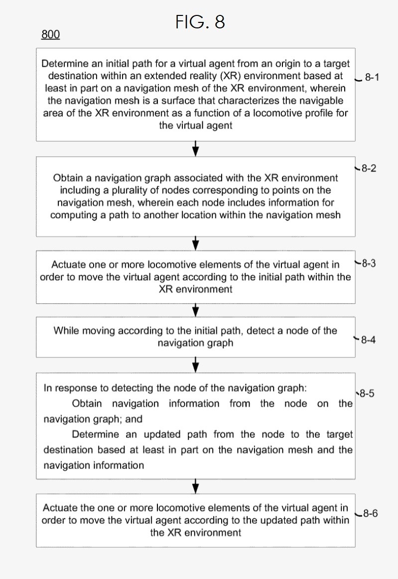 該專(zhuān)利名為“改進(jìn)尋路方法和設(shè)備”,蘋(píng)果專(zhuān)利摘要:“在某些實(shí)現(xiàn)中,一種改進(jìn)的尋路方法在虛擬代理操作系統(tǒng)上執(zhí)行,該虛擬代理操作系統(tǒng)包括非暫時(shí)性存儲(chǔ)器和與非暫時(shí)性存儲(chǔ)器耦合的一個(gè)或多個(gè)處理器。該方法包括:確定虛擬代理到至少部分基于XR環(huán)境的導(dǎo)航網(wǎng)格目標(biāo)目的地;啟動(dòng)虛擬代理的機(jī)車(chē)元件以便根據(jù)初始路徑移動(dòng)虛擬代理;在根據(jù)初始路徑移動(dòng)時(shí),檢測(cè)導(dǎo)航的節(jié)點(diǎn)圖;響應(yīng)于檢測(cè)到導(dǎo)航圖的節(jié)點(diǎn):從導(dǎo)航圖的節(jié)點(diǎn)獲得導(dǎo)航信息;以及至少部分基于導(dǎo)航網(wǎng)格和導(dǎo)航信息確定從節(jié)點(diǎn)到目標(biāo)目的地的更新路徑;并根據(jù)更新后的路徑啟動(dòng)虛擬代理的機(jī)車(chē)元素。”