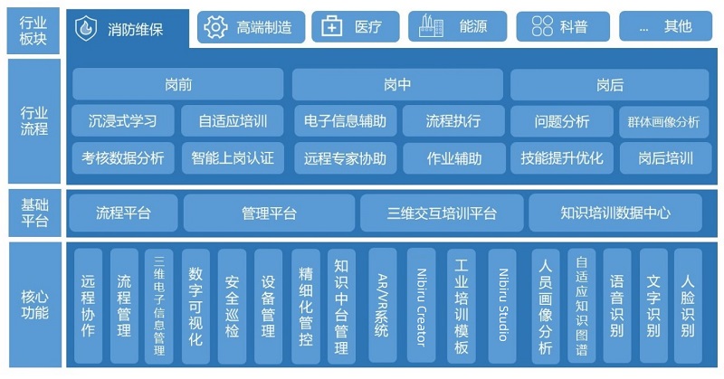 麥特威爾利用Nibiru Creator對(duì)培訓(xùn)和流程的方法論, 結(jié)合自身數(shù)十年在消防維保的經(jīng)驗(yàn)積累,推出了消防維保設(shè)備,充分打通崗前、崗中和崗后。崗前,需要進(jìn)行一系列沉浸式VR培訓(xùn),確保人員已真實(shí)掌握了實(shí)操技能,能夠從事運(yùn)維工作。崗中,可通過(guò)終端設(shè)備隨時(shí)遠(yuǎn)程連接后臺(tái)專家,進(jìn)行相關(guān)專業(yè)指導(dǎo),保障工作的高質(zhì)量。崗后,系統(tǒng)根據(jù)人員學(xué)習(xí)、工作等數(shù)據(jù),生成個(gè)人畫(huà)像,并根據(jù)個(gè)人畫(huà)像定制其薄弱技能知識(shí)點(diǎn)培訓(xùn)內(nèi)容,并推送給終端設(shè)備方便人員提升其個(gè)人技能。