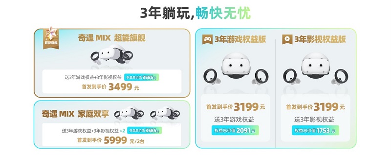 ?“3年游戲影視全能版”首發(fā)到手價(jià)3499元,包含奇遇MIX主機(jī)1臺(tái)、3年影視權(quán)益、3年游戲權(quán)益,首發(fā)用戶額外贈(zèng)送10款熱門游戲,主機(jī)外權(quán)益總價(jià)值3585元;