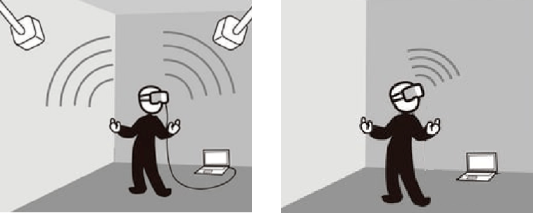 長久以來,VR定位方案主要分為兩種:Outside-in和Inside-out。前者通過將傳感器部署在與頭盔或者人體無直接連接的周邊環(huán)境中(即基站),實現(xiàn)大范圍檢測,一般用于支持多人互動應用場景。