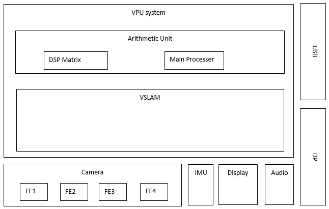 首先是頭顯部分,基于定位精度、速度和成本等因素的考量,大朋VR E4采用了視覺(V)+慣性傳感器(I),構(gòu)成Vslam實現(xiàn)系統(tǒng)。大朋VR團隊基于Intel Movidius高性能VPU進行開發(fā)設計工作,重新設計傳感攝像頭模塊的同時,也帶來了全新的頭戴硬件布局。
