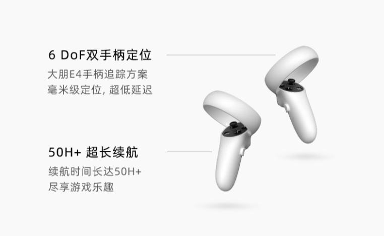 其次是手柄,大朋VR E4的 6DoF動作控制器,采用了紅外光主動式光學定位追蹤方案,以分布式計算方式與高精度的緊耦合融合算法實現(xiàn)手柄和頭顯的交互,完成手柄的6DoF高精度定位追蹤。