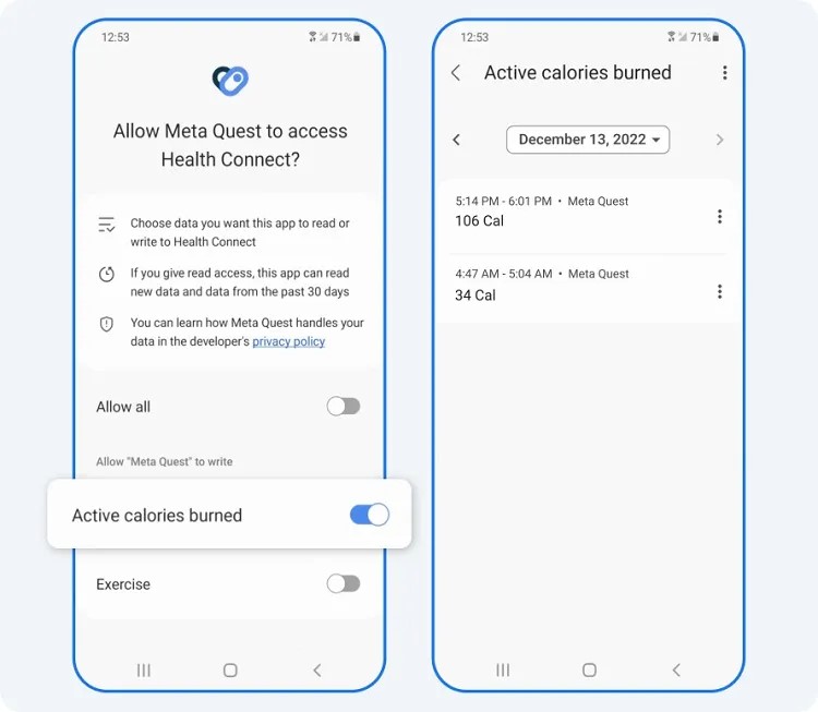 基于最新更新,Meta通過Android Health Connect將同樣功能引入Android設(shè)備,這將支持Android用戶記錄VR健身數(shù)據(jù),而無需手動輸入健身時間,并將VR健身和統(tǒng)計數(shù)據(jù)與Android設(shè)備所有其他日常健身活動相結(jié)合。最終,用戶將能追蹤所有VR健身數(shù)據(jù)。