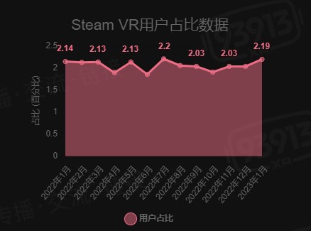 近日,Steam平臺公布了2023年1月的軟件與硬件調(diào)查報告。本月報告數(shù)據(jù)顯示,Steam平臺VR用戶占比在1月份有小幅上漲(2.19%, +0.16%),增幅為7.88%。