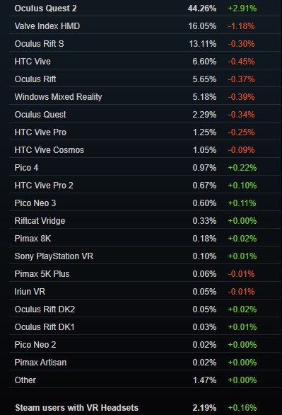 Meta陣營設(shè)備占比攀升(65.39%,+1.92%),其中表現(xiàn)最強勁的是Quest 2,占比為44.26%(+2.91%),其他設(shè)備中,除DK1(0.03%,+0.01%)和DK2(0.05%,+0.02%)用戶占比略微上漲,Quest(2.29%,-0.34%),Oculus Rift(5.65%,-0.37%)與Oculus Rift S(13.11%,-0.30%)用戶占比均有一定幅度的下降。