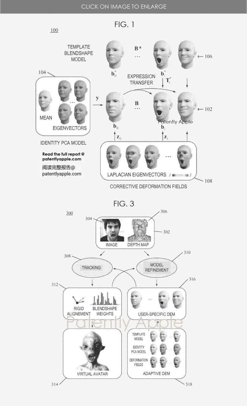 蘋果公司的專利圖1顯示了該專利一個實施例的動態(tài)表情模型示意圖;圖3顯示了一個優(yōu)化管道的流程圖。