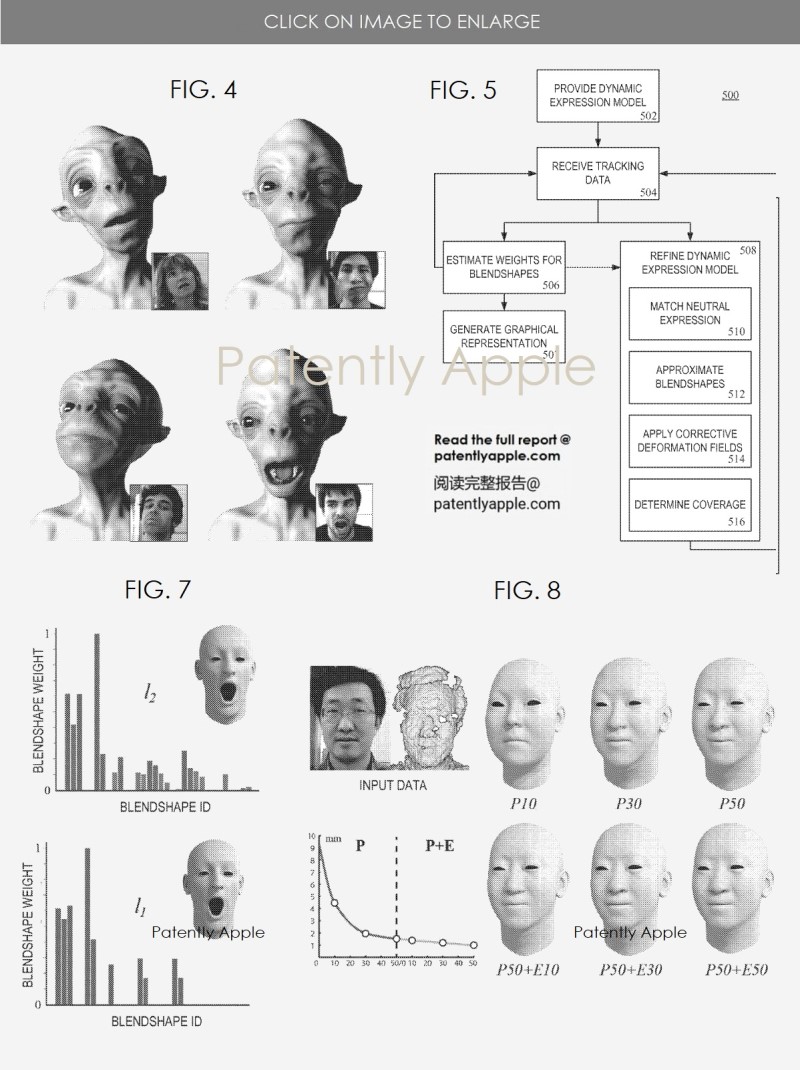 蘋果公司的專利圖7顯示了用于近似用戶面部表情的不同混合形狀權(quán)重集;圖8描述了根據(jù)一個實施例使用不同動態(tài)表情模型對中性面部表情進行初步估計的結(jié)果。
