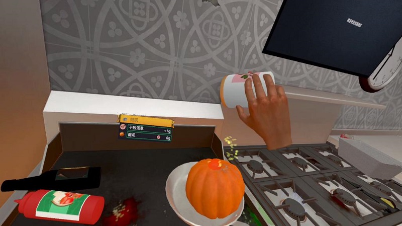 此外,本作中還增加了許多需要你雙手一起進(jìn)行的操作,例如取下瓶塞、打開蓋子,你甚至可以一只手握著食材,另一只手拿著刀直接在手里面切!