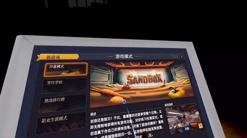 從游戲模式來說,游戲分為沙盒模式、烹飪學(xué)校、挑戰(zhàn)排行榜和職業(yè)生涯模式。沙盒模式自然就是大家最喜聞樂見的模式,沒有任何約束也沒有時間限制,可以隨意地對廚房進(jìn)行搶砸……啊不,練習(xí)。想要認(rèn)真對待或花式惡搞都可以,是這款游戲最有趣的部分。烹飪學(xué)校則是帶你學(xué)習(xí)有關(guān)這個廚房里面的一切,從購買食材到上手切菜,任何不懂的部分都可以隨時回來觀看教學(xué)。挑戰(zhàn)排行榜顧名思義就是和全世界的“五星級”廚師們進(jìn)行比較,看誰更勝一籌。最后的職業(yè)生涯模式就是要擼起袖子認(rèn)真打造自己的餐廳,如果搗亂累了,想要測試一下自己的真水準(zhǔn),也可以挑戰(zhàn)試試。
