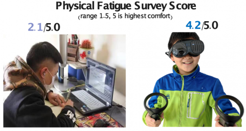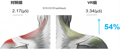 數(shù)據(jù)顯示:VR組比傳統(tǒng)網(wǎng)課組肌肉骨骼活躍程度高54%。兩組被試者分別在課程期間抽取10分鐘EDA皮電數(shù)據(jù)監(jiān)測肌肉活躍量,數(shù)據(jù)越高代表肌肉活躍量越強。VR組EDA均值3.34,對照組EDA均值2.17,生理皮電汗腺分泌與肌肉活躍度有密切關(guān)系,可看出VR組肌肉活躍度更高,相對于傳統(tǒng)網(wǎng)課組,VR組在肩頸部位的6自由度交互設(shè)計能降低伏安久坐的疲勞程度。