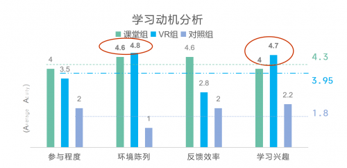 研究人員讓樣本根據(jù)學(xué)習(xí)動機自評量表對在校課堂的參與程度、環(huán)境陳列、反饋效率、學(xué)習(xí)興趣打分,并在22天學(xué)習(xí)后,分別對VR環(huán)境和傳統(tǒng)網(wǎng)課環(huán)境的四項學(xué)習(xí)動機自評打分,并與每個人真實學(xué)校課堂環(huán)境自評結(jié)果相比。其中,VR組環(huán)境成列、學(xué)習(xí)興趣維度高于學(xué)校課堂。研究人員認(rèn)為可能是因為VR模擬課堂的環(huán)境陳列根據(jù)課程內(nèi)容做出更高的匹配度,增強學(xué)習(xí)氛圍,同時VR課程內(nèi)容的身臨其境感和多樣化的道具輔助使用,讓學(xué)生更容易對學(xué)習(xí)過程產(chǎn)生興趣。(學(xué)習(xí)動機量表1-5分,分?jǐn)?shù)越高代表動機越明顯)