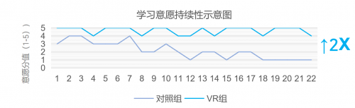 研究中兩組樣本每日學(xué)習(xí)后填寫學(xué)習(xí)意愿量表,共填寫22次,所產(chǎn)生的自身學(xué)習(xí)意愿趨勢如圖所示:VR組平均學(xué)習(xí)意愿為4.7,對照組為2.2,VR組的學(xué)習(xí)意愿更強烈,是對照組的2倍。尤其可以看到隨著時間推移,VR組的學(xué)習(xí)意愿能持續(xù)保持高位。研究人員認(rèn)為依然可能跟VR的沉浸體驗有關(guān)系。(學(xué)習(xí)意愿量表5分制,1-5代表學(xué)習(xí)的意愿程度。)而這一發(fā)現(xiàn)與哈里斯和里德(Harris &Reid, 2005)研究發(fā)現(xiàn)一致:“VR可以提高兒童的學(xué)習(xí)動機水平”。