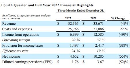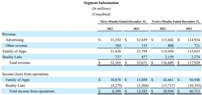 2月1日,Meta 披露的財(cái)報(bào)顯示,公司2022年第四季度總營(yíng)收為321.65億美元,較上年同期的336.71億美元下降4%,連續(xù)第三個(gè)季度減少;凈利潤(rùn)為46.52億美元,較上年同期的102.85億美元大降55%。