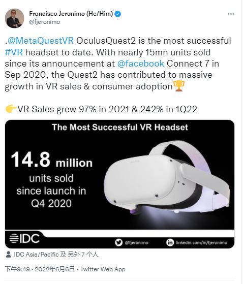 根據(jù)IDC的數(shù)據(jù),截至2022年Q1,Quest 2已經(jīng)銷售了1480萬(wàn)臺(tái)。該預(yù)測(cè)數(shù)據(jù)雖然被認(rèn)為偏高,但多數(shù)機(jī)構(gòu)都評(píng)估其實(shí)際銷量不低于千萬(wàn)。或許是因?yàn)?021年賣得太多,Quest 2的銷量在2022年有所下降,但它仍然是最受歡迎的消費(fèi)級(jí)VR頭顯設(shè)備。